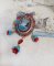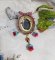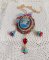 J’ai ajouté autour du cabochon, des chaînes strass (Crystal, verre, acrylique) dans les nuances de Bleu Turquoise, Crystal et Rouge Foncé à laquelle s’ajoute une chaîne doré boule, intercalaire dentelle (tous les deux en métal), fleurs clochettes et tulipes verres.